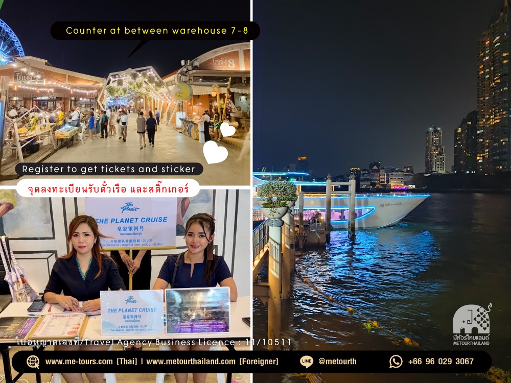 Before boarding, please collect your ticket first. (Advance booking is required for all cruises.) The ticket counter and registration point are located at ASIATIQUE The Riverfront, between Warehouse 7–8. For this trip, we took The Planet Cruise, evening service from 8:00 PM – 10:00 PM (2 hours). Registration is available from 6:30 PM – 7:45 PM. We suggest arriving at least 30 minutes before departure to avoid any rush. Please also plan your travel time in advance, as Bangkok traffic can be unpredictable and may cause delays.