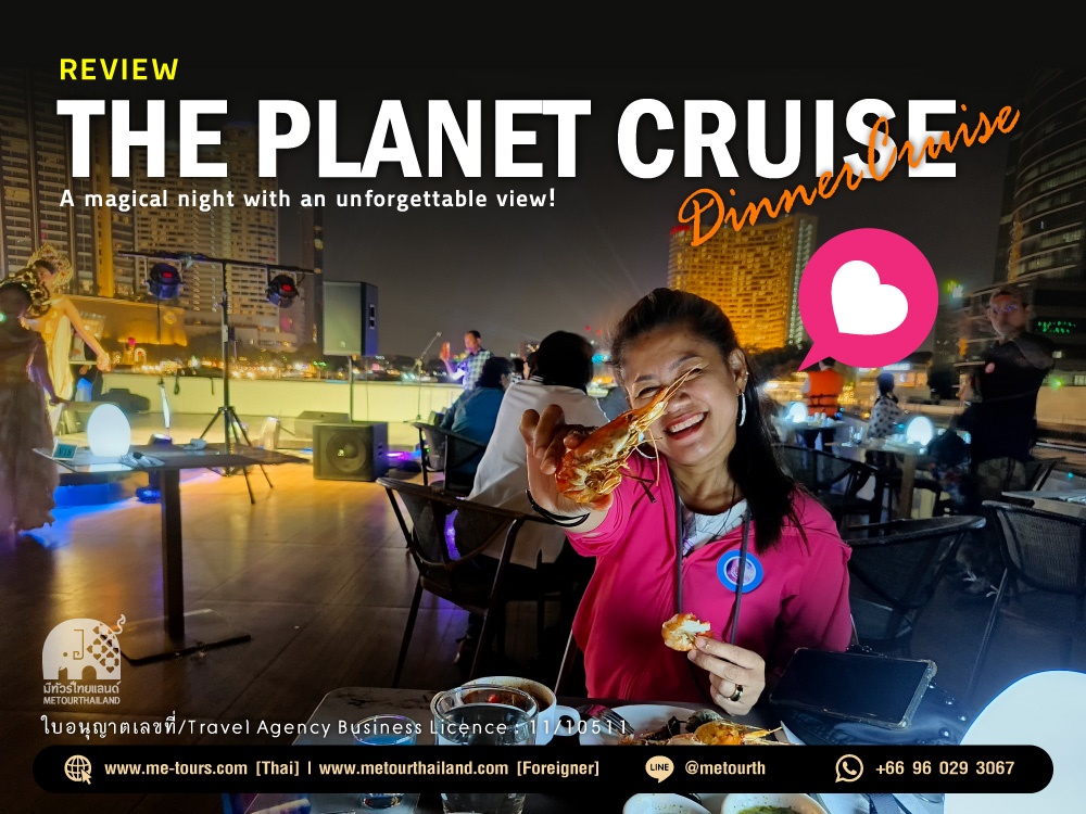 Review: The Planet Cruise A dinner cruise along the Chao Phraya River with The Planet Cruise offers a luxurious and romantic experience that should not be missed. The evening atmosphere, with its stunning riverside scenery, makes the journey even more enchanting. Although it was a bit late this time, the views were still incredibly beautiful. Duration 20.00 – 22.00 Hrs. (2 Hours)